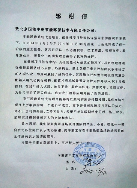 內蒙古豐泰脫硫系統改造EPC項目受業主表揚