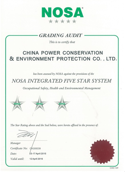 7月13日,經(jīng)過NOSA科學(xué)、嚴(yán)格地考評,國能中電被正式授予“NOSA五星管理系統(tǒng)”三星級證書。