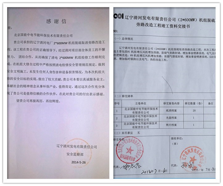 在公司總部的正確領(lǐng)導(dǎo)下,經(jīng)過(guò)清河EPC旁路改造項(xiàng)目部全體成員的共同努力,7月18日,遼寧清河發(fā)電有限責(zé)任公司業(yè)主代表在竣工資料交接證書(shū)上簽字,標(biāo)志著我公司承擔(dān)的遼寧清河電廠2*600MW機(jī)組脫硫取消旁路改造工程正式竣工驗(yàn)收,成功打響了我司在中國(guó)電力投資集團(tuán)的第一槍。