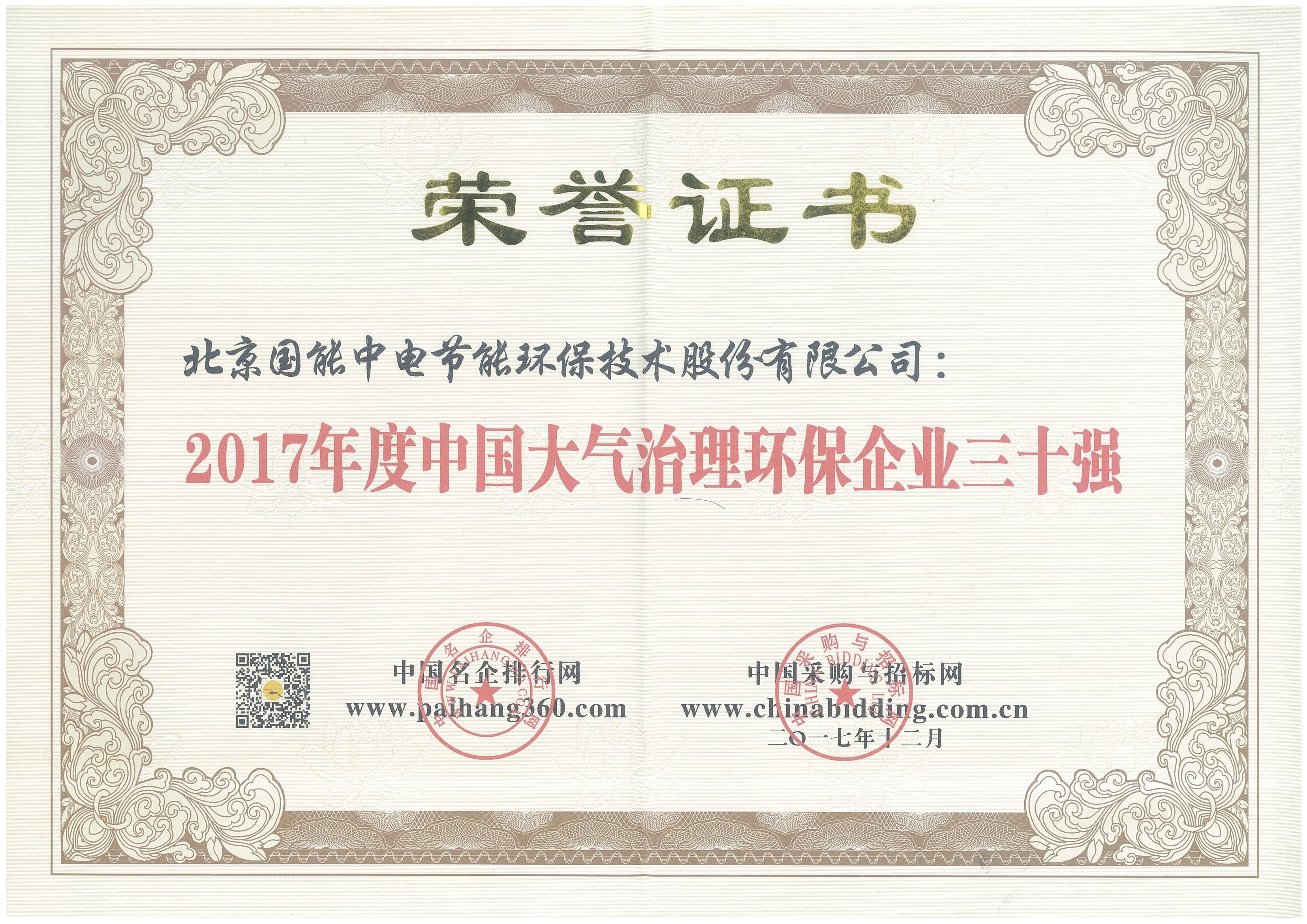 2017年度中國大氣治理環保企業三十強