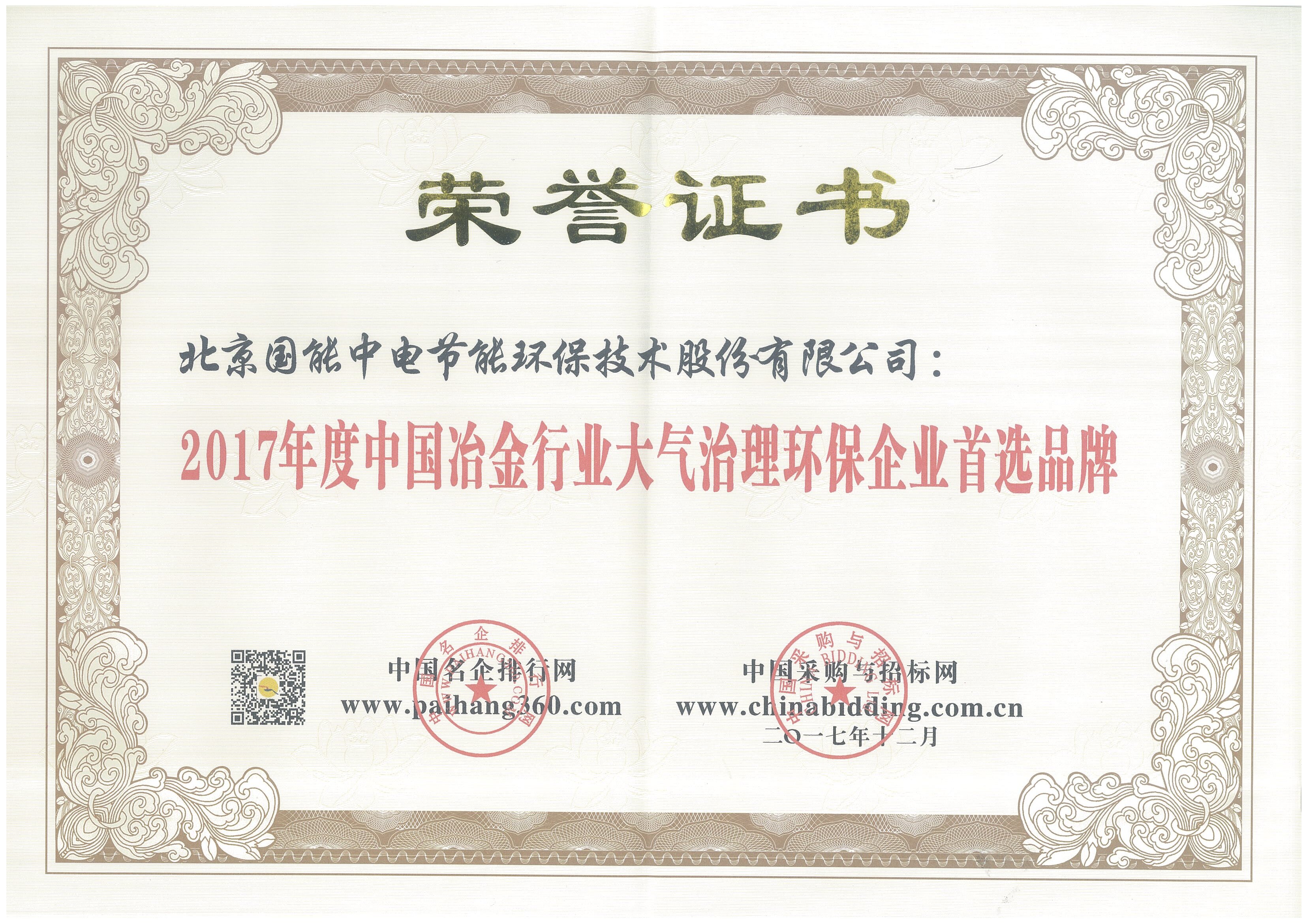 2017年度中國冶金行業大氣治理環保企業首選品牌